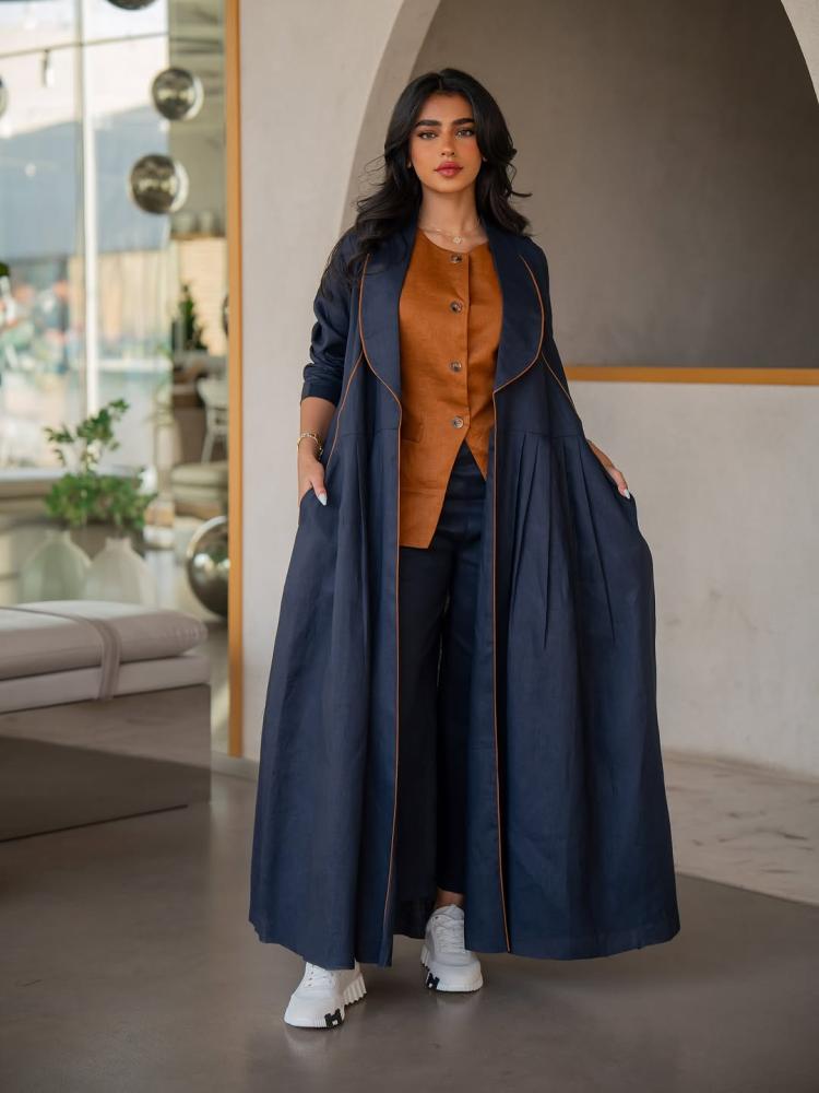 تميزي بإطلالة أنيقة وعصرية مع هذه العباية المصممة من قماش الينن الطبيعي، بلون كحلي او اسود أنيق مع تفاصيل باللون النحاسي تأتي مع طقم داخلي مكون من صديرية بلون نحاسي وبنطال واسع بلون كحلي، لتمنحك مظهراً متكاملاً وراحة طوال اليوم.
