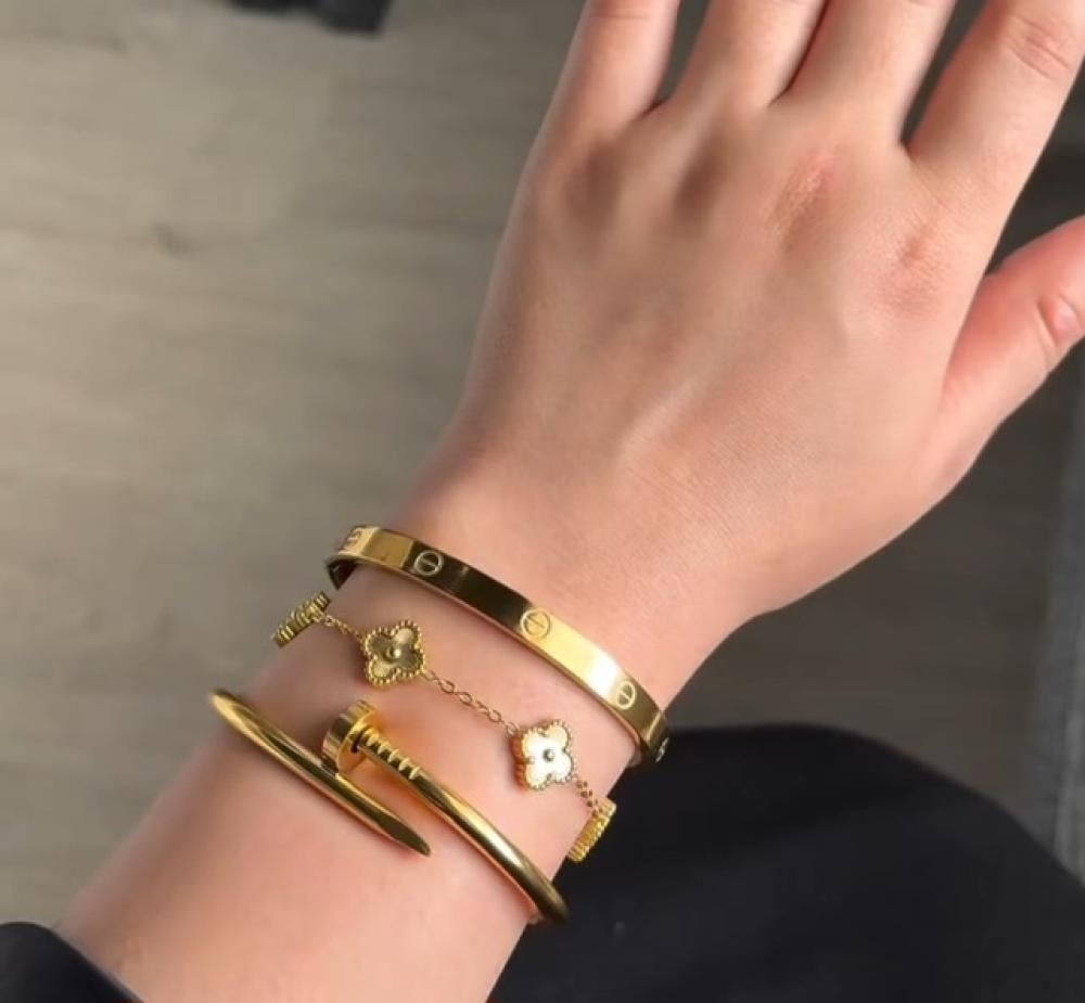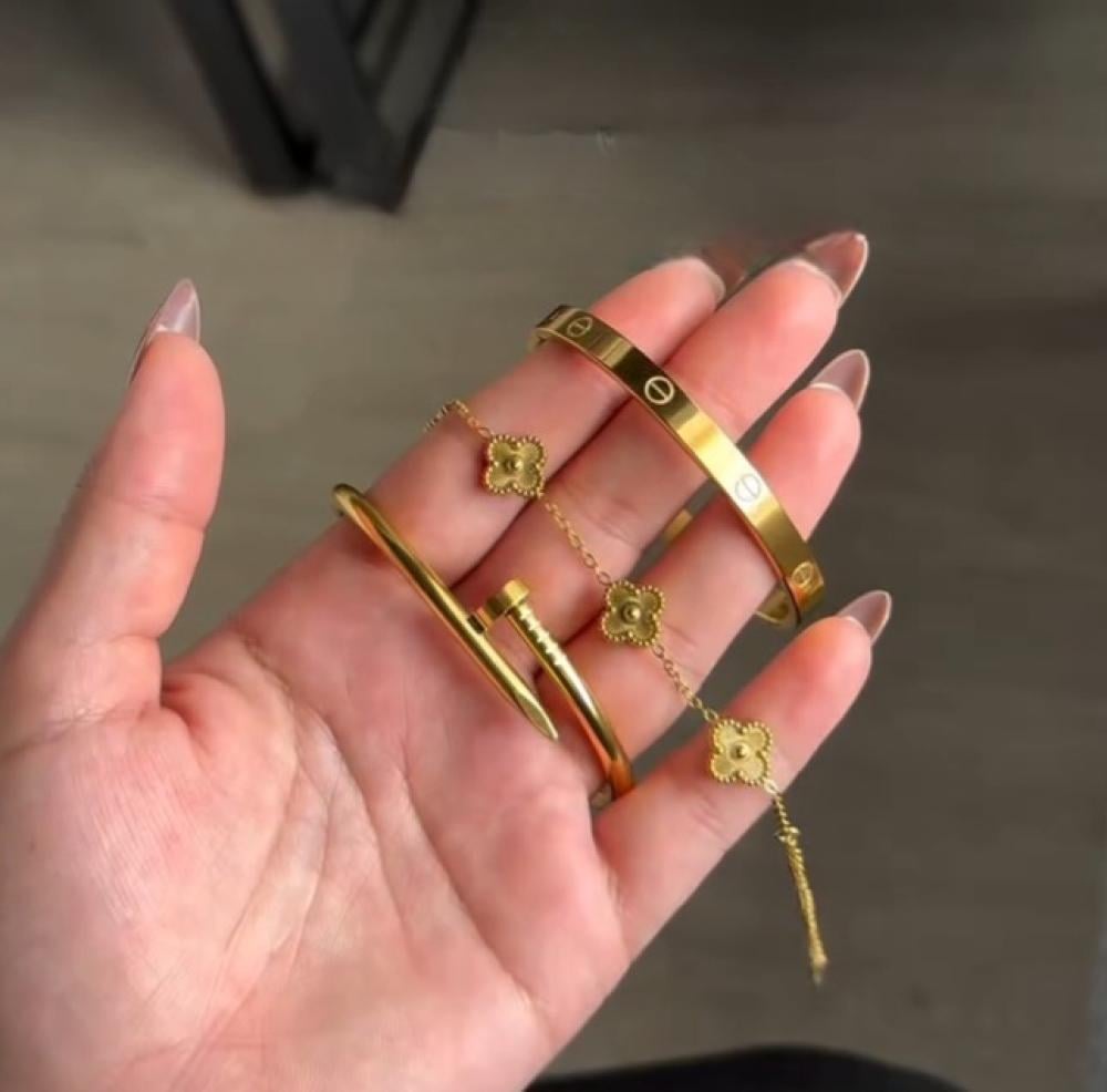تألقي بإطلالة فاخرة مع مجموعة الأساور الذهبية المميزة التي تجمع بين الأناقة والعصرية. تحتوي المجموعة على تصميمات متنوعة تشمل سوارًا بتفاصيل زهرة البرسيم المصنوع من عرق اللؤلؤ، وسوارًا بسلسلة ذهبية رفيعة مع عقدة أنيقة، بالإضافة إلى سوار بتصميم معدني عصري مرصع بلمسات براقة. هذه المجموعة مثالية لإبراز أنوثتك وتنسيقها مع إطلالاتك اليومية أو المسائية، كما تُعد خيارًا رائعًا كهدية فاخرة.